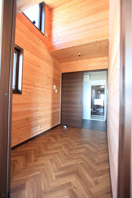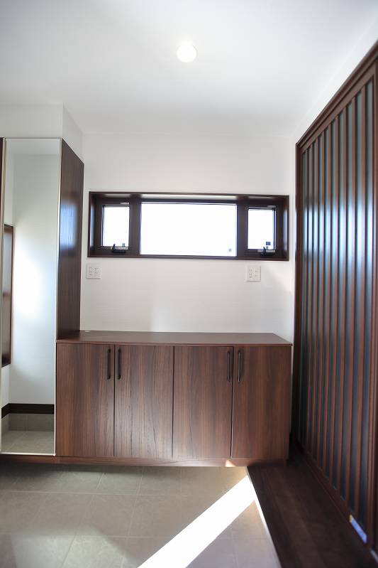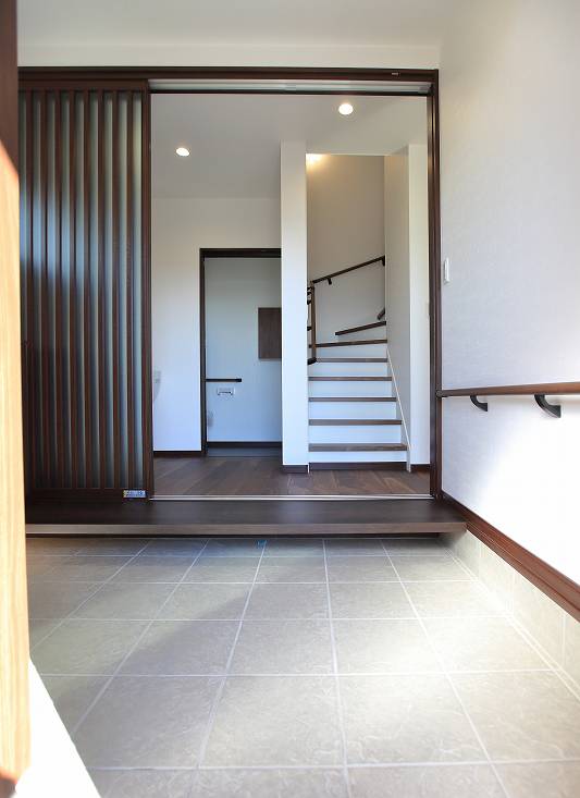 日本家屋らしい式台を設置し、格子がある引き戸で古民家風な玄関に仕上げました。