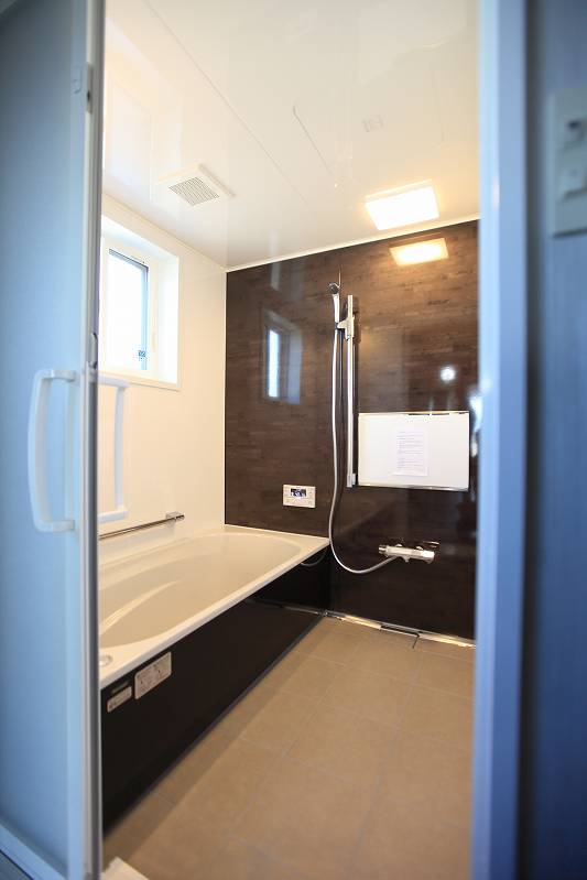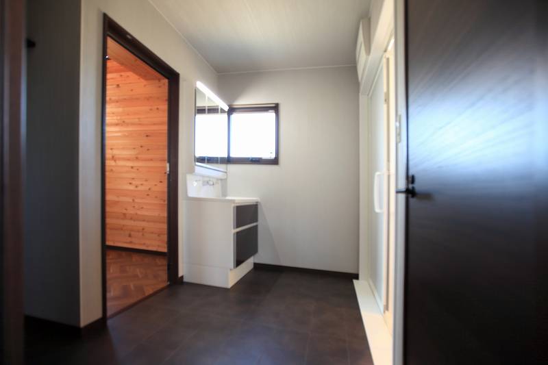 室内干し部屋の横には脱衣所洗面台。さらに奥はバスルーム。洗濯機は室内干し部屋に設置。脱衣所で出た洗濯物はすぐ隣の室内干し部屋の洗濯機で洗濯をしてすぐさま室内干し部屋に洗濯を干すことが可能です。忙しい奥様に優しい設計をしました。