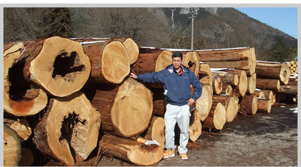上の写真は木曽の木曽官材市売協同組合での写真です。製材する前の檜の太さは立派なものです。さすが樹齢400年です。